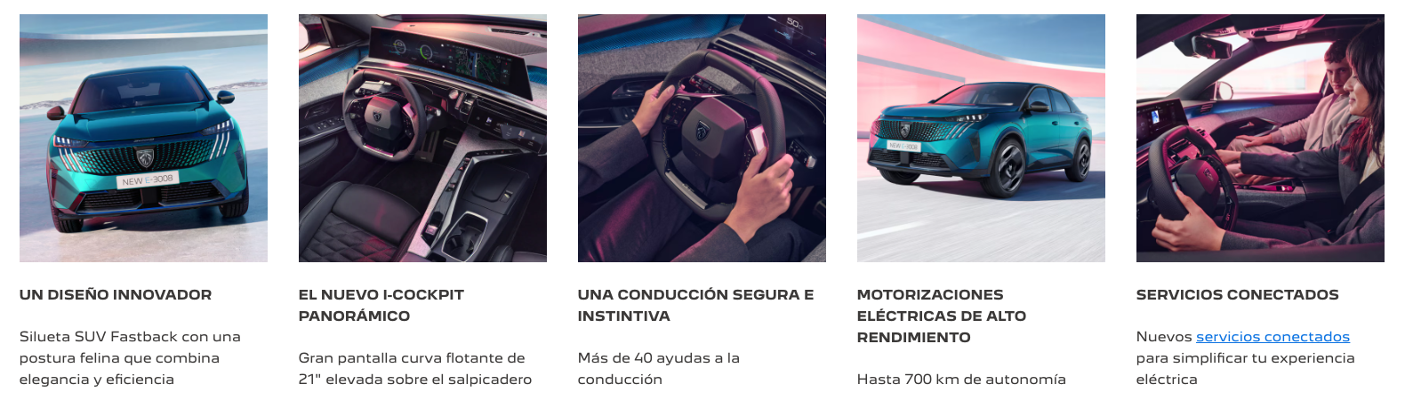 Descubre el PEUGEOT E-3008 con su elegante silueta SUV fastback y el nuevo PEUGEOT i-Cockpit® panorámico para un placer de conducción intuitivo. Esta nueva generación de SUV eléctricos se basa en una plataforma innovadora y conectada que está revolucionando la movilidad: